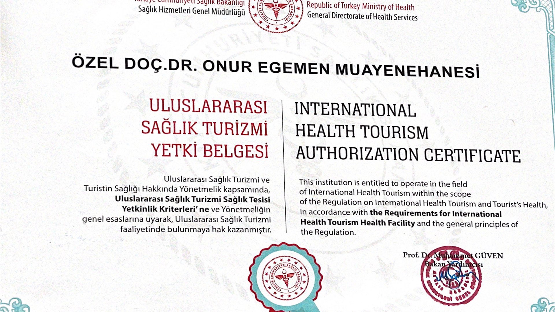 His clinic holds the official International Health Tourism Authorization Certificate, proving that every stage of treatment complies with the Ministry of Health standards and ensures a safe environment for international patients.